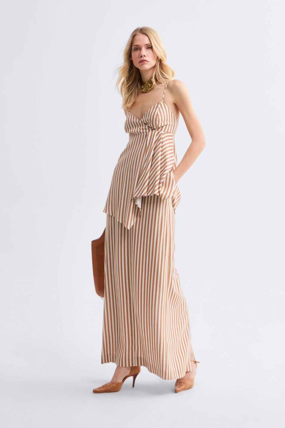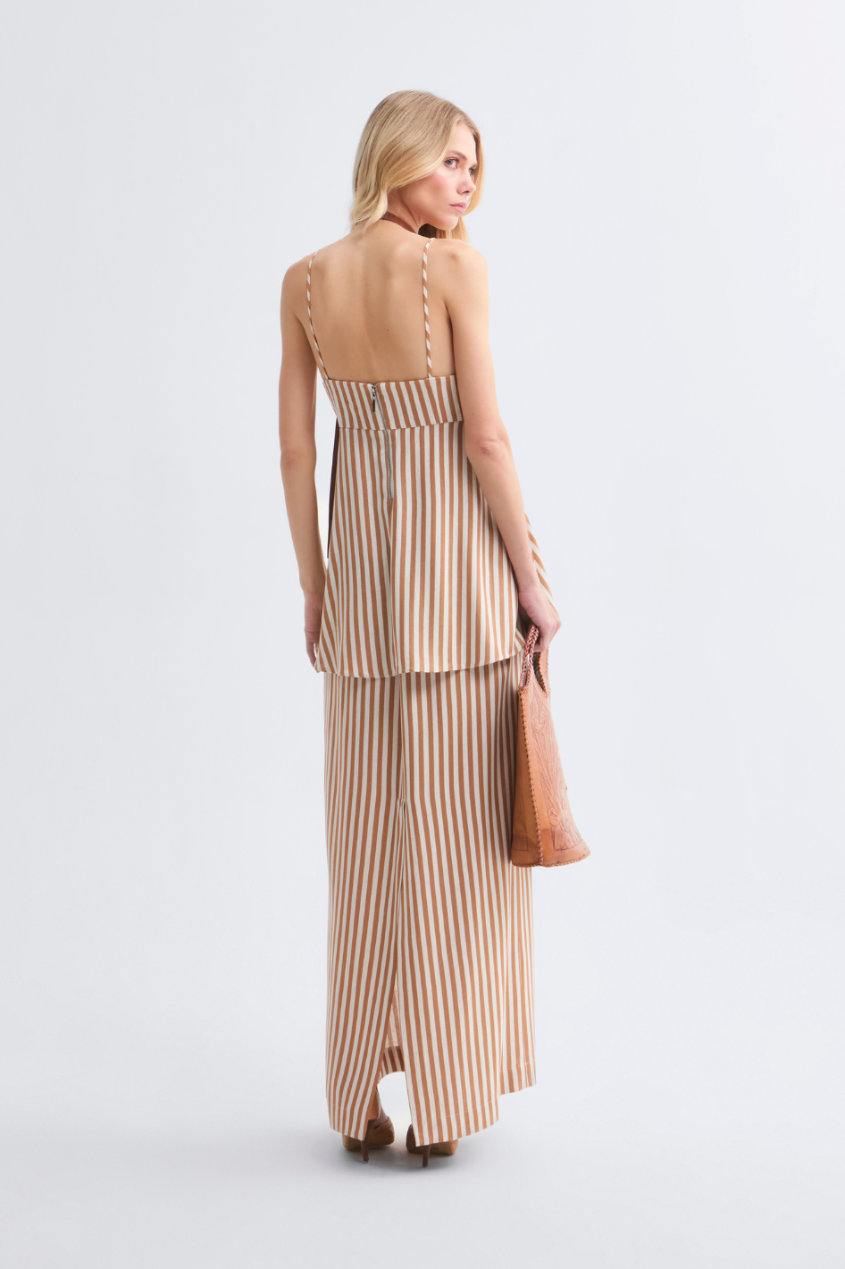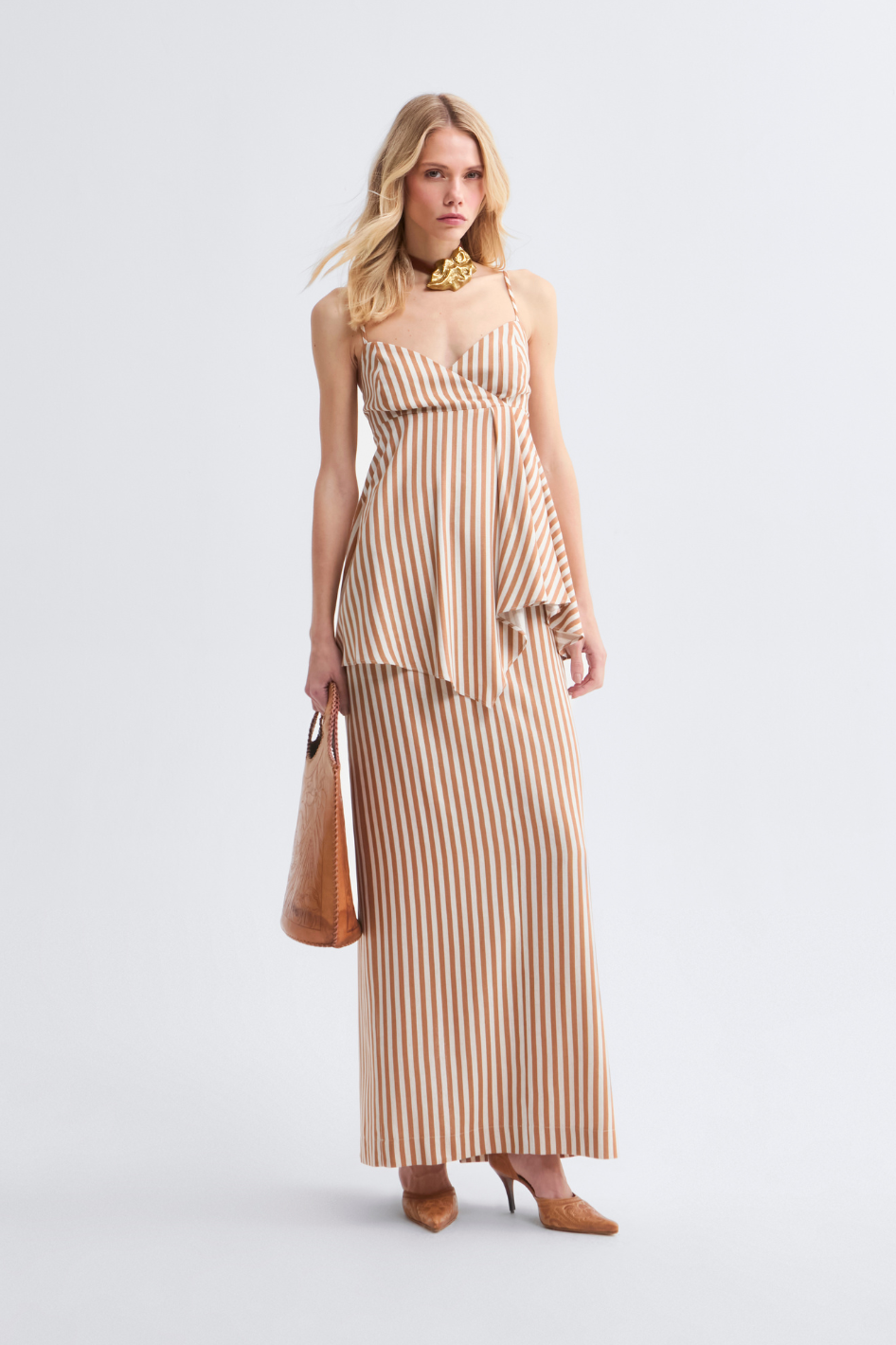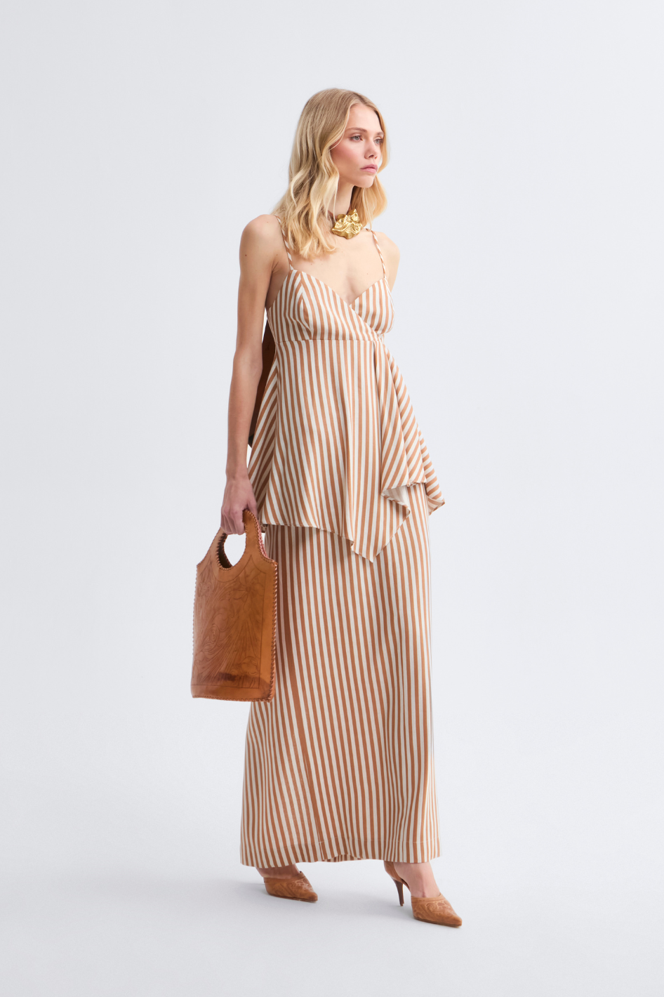Confeccionada em tecido de listras verticais em tons neutros, ela carrega uma sofisticação natural e fresh — perfeita para dias quentes ou sobreposições elegantes. Use com a saia Ava para um conjunto que traduz o effortless chic que amamos.