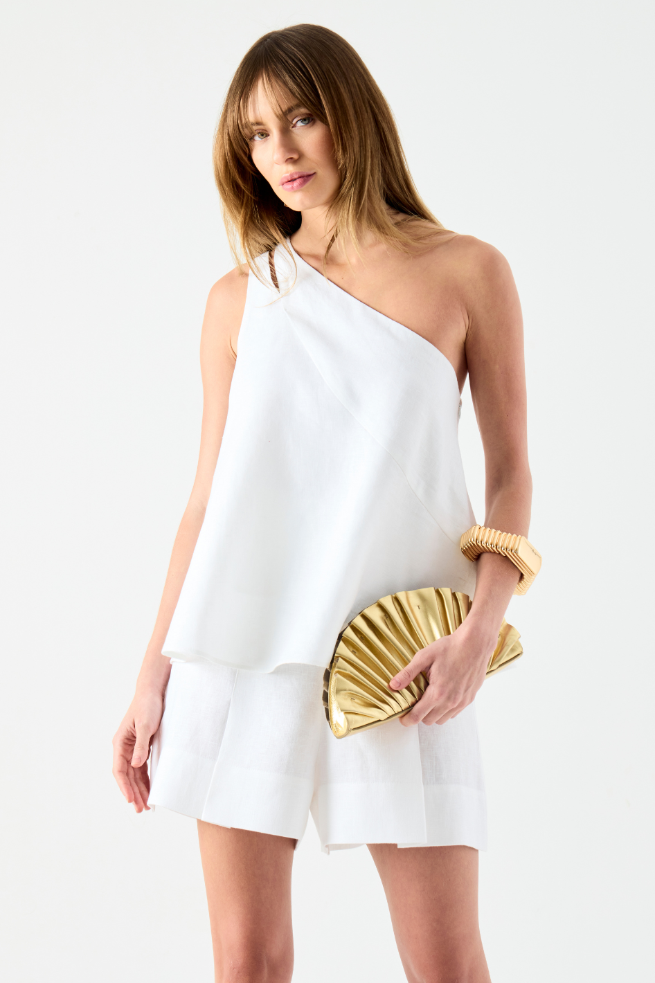 Confeccionada em linho 100% natural  o Shorts Brunella tem um toque macio e um caimento fluido impecável. O detalhe da prega central nas pernas adiciona movimento e reforça a proposta de alfaiataria moderna. Já o cós largo com passantes largos reforça o acabamento impecável da peça e permite composições com cintos, sem comprometer a estética minimalista.