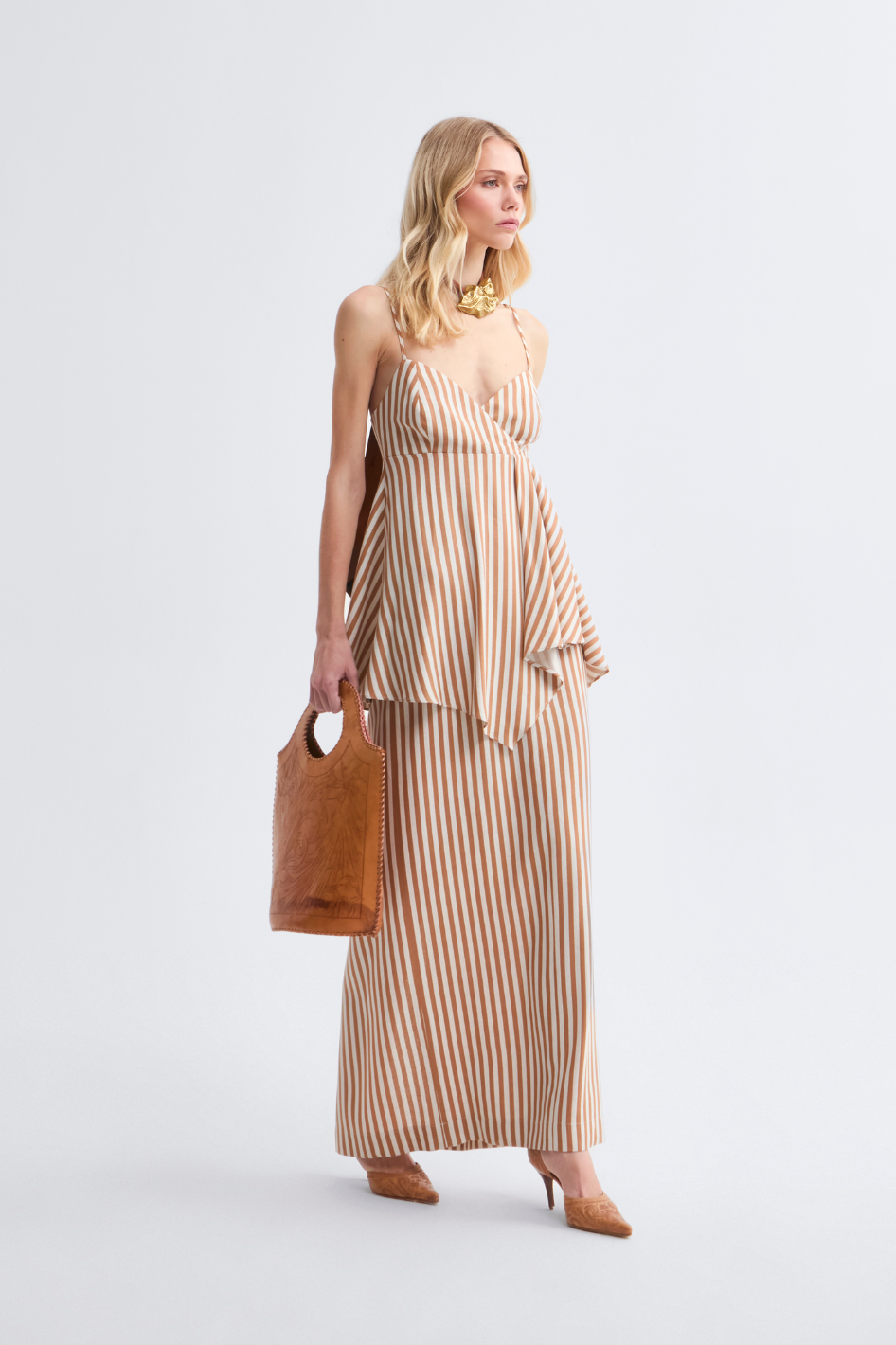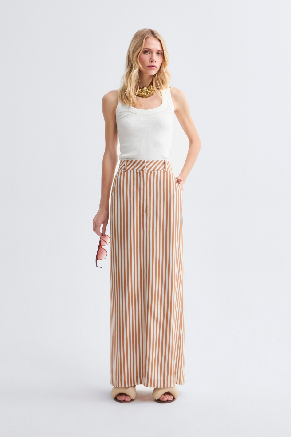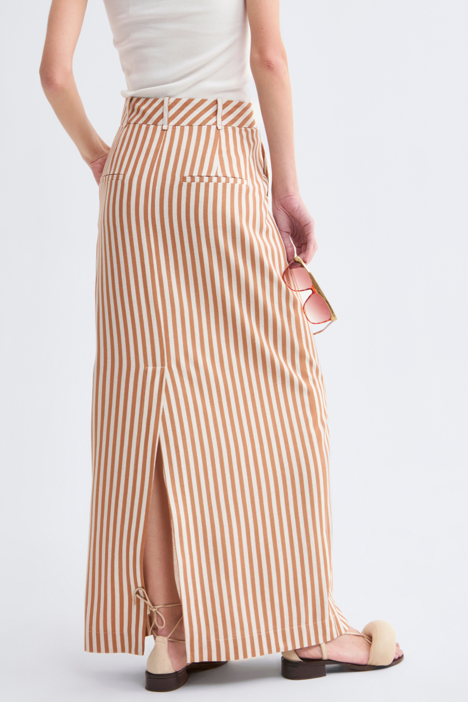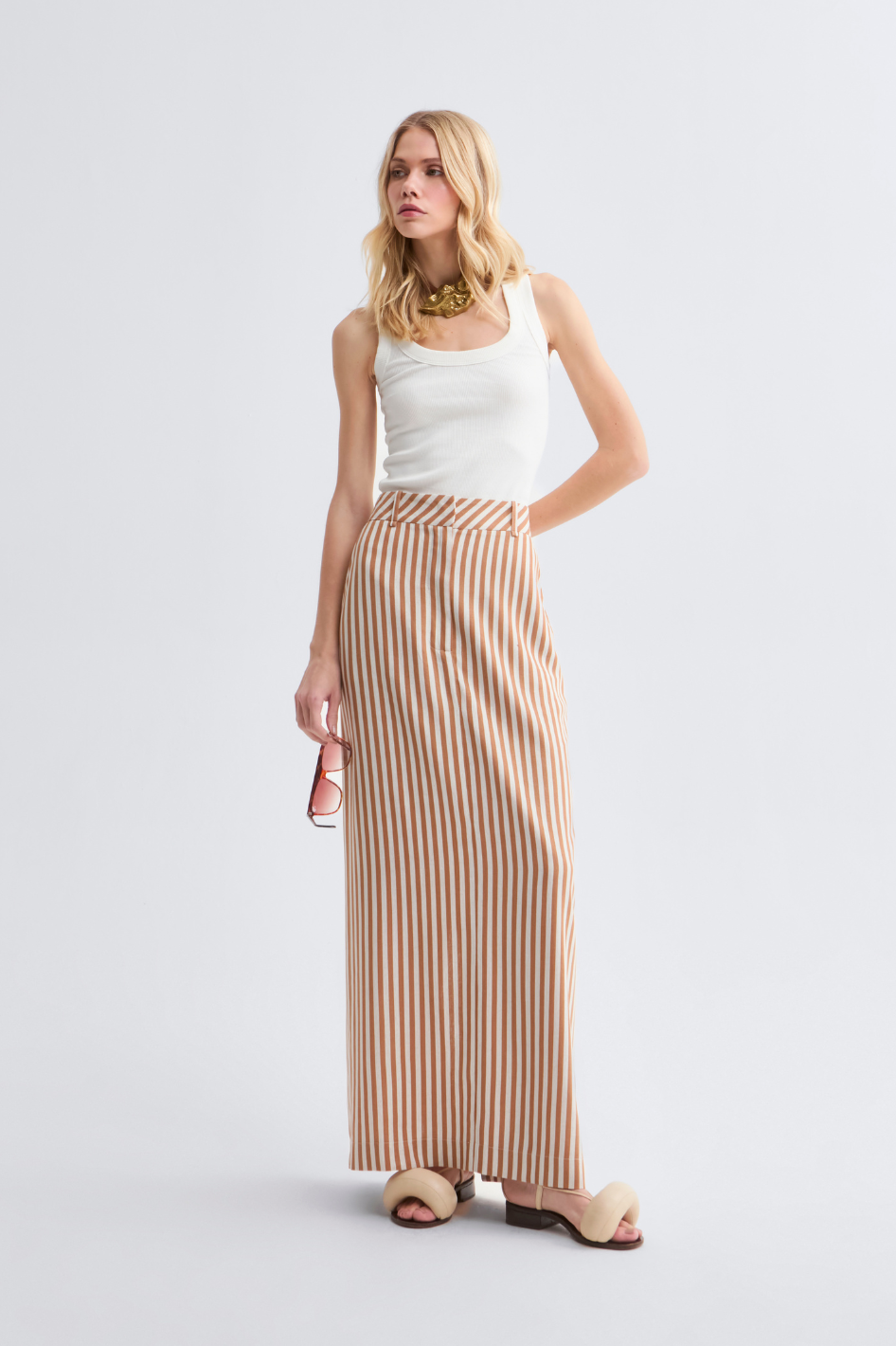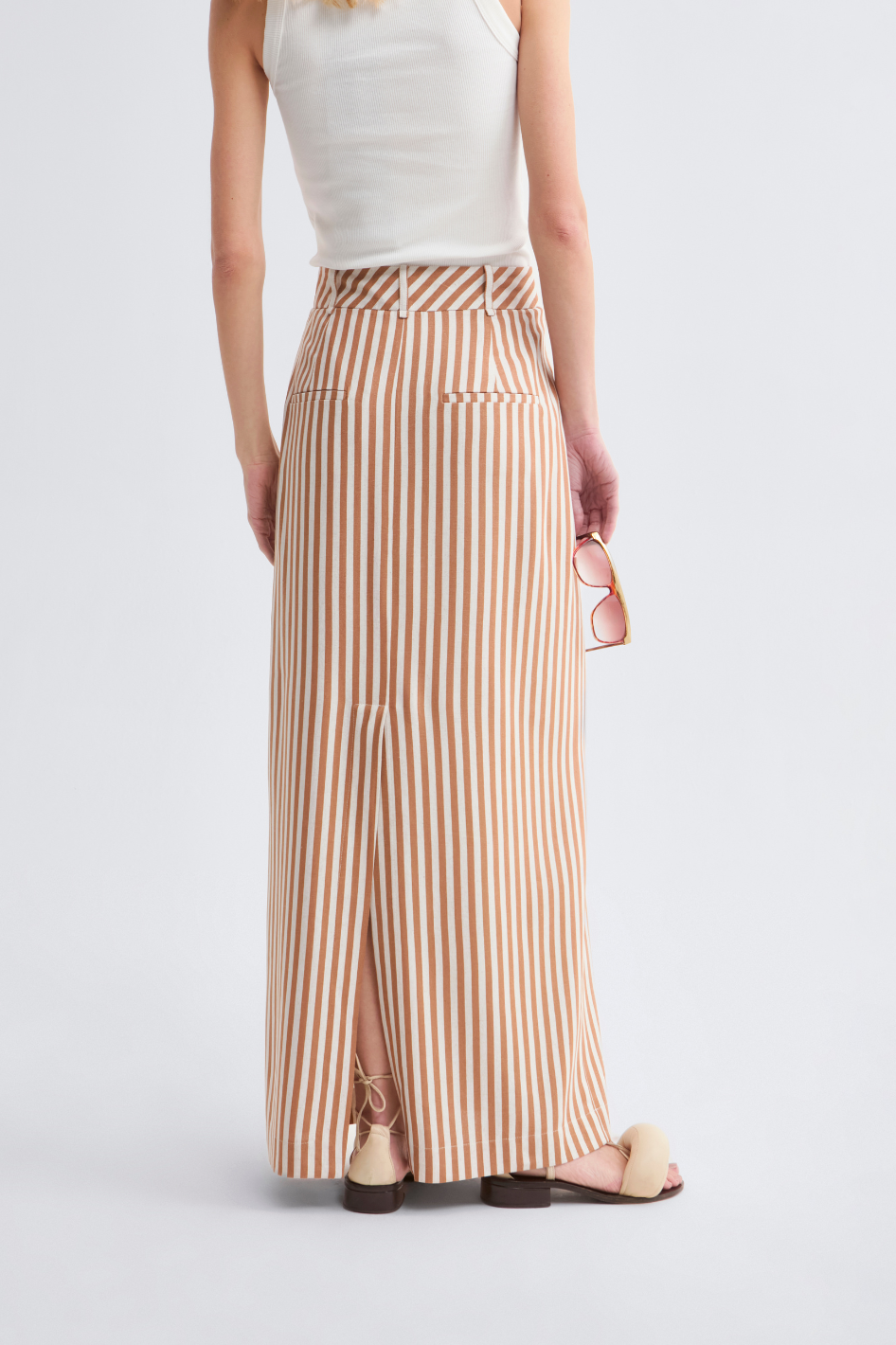 A padronagem listrada aparece com sofisticação na Saia Ava – peça que traduz o encontro entre a leveza do verão e a elegância da alfaiataria.