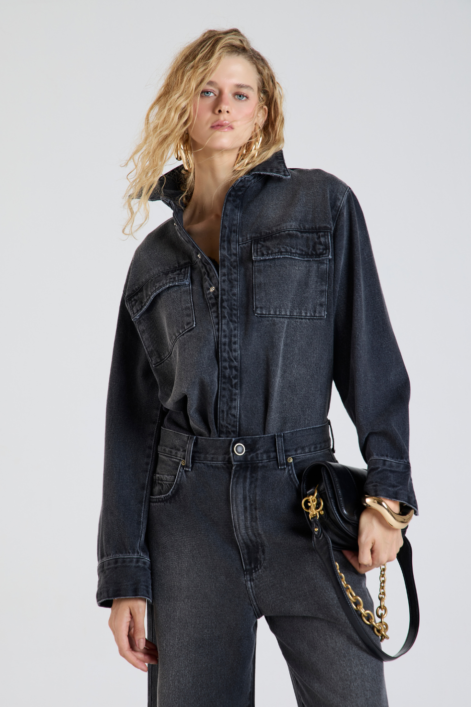 Os punhos largos e o recorte sutil na barra proporcionam movimento e versatilidade, perfeita para usar solta, com leve sobreposição ou coordenada com o jeans da mesma proposta para um look monocromático moderno e sofisticado.