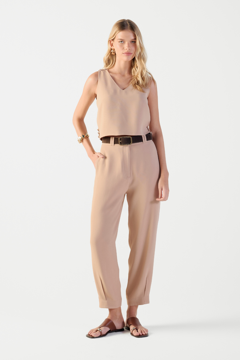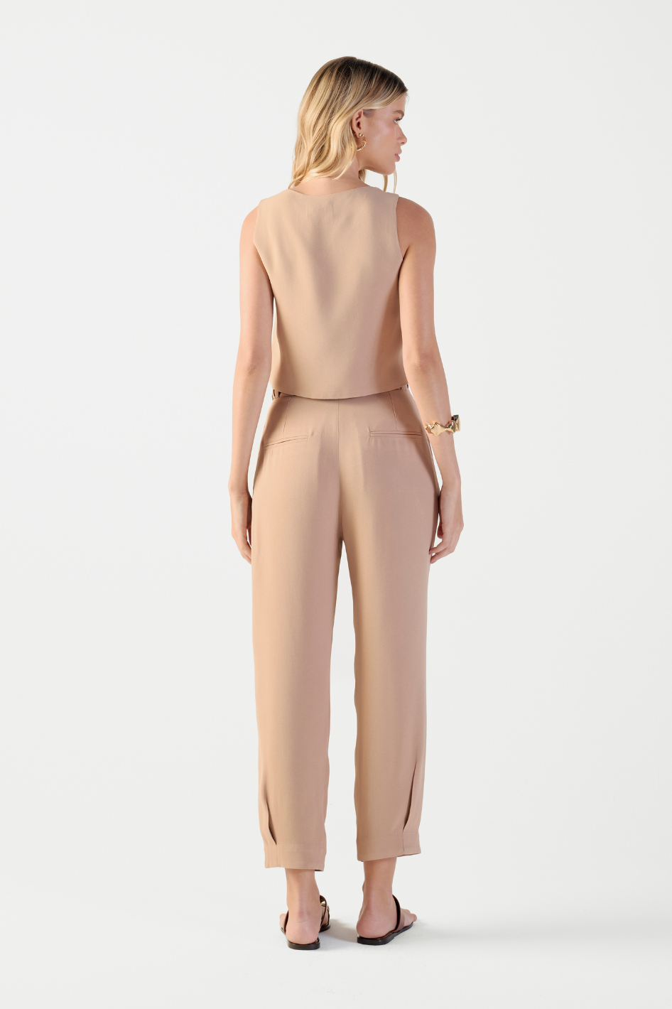 A Calça Olivia é a definição de elegância minimalista. Confeccionada em crepe de acetato, traz a modelagem cenoura sem pregas, garantindo um caimento sofisticado e atemporal. O cós alto valoriza a silhueta, enquanto os bolsos alfaiataria nas costas unem funcionalidade e estilo. O detalhe de pregas na barra adiciona um toque refinado, e o passante duplo reforça a estrutura da peça. Versátil e moderna, a Olivia transita com facilidade entre produções casuais e sofisticadas.