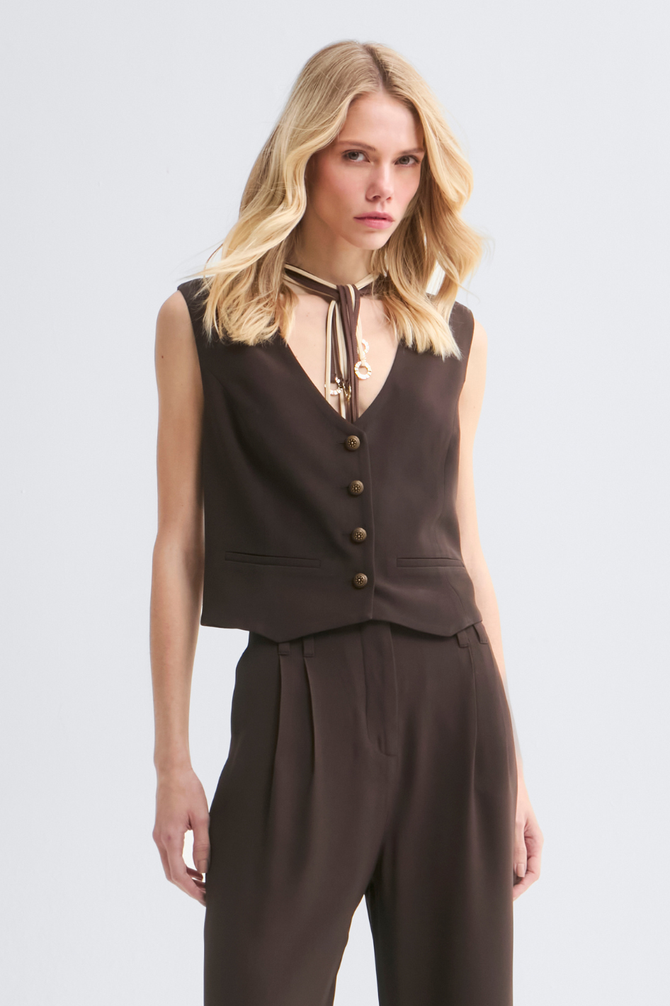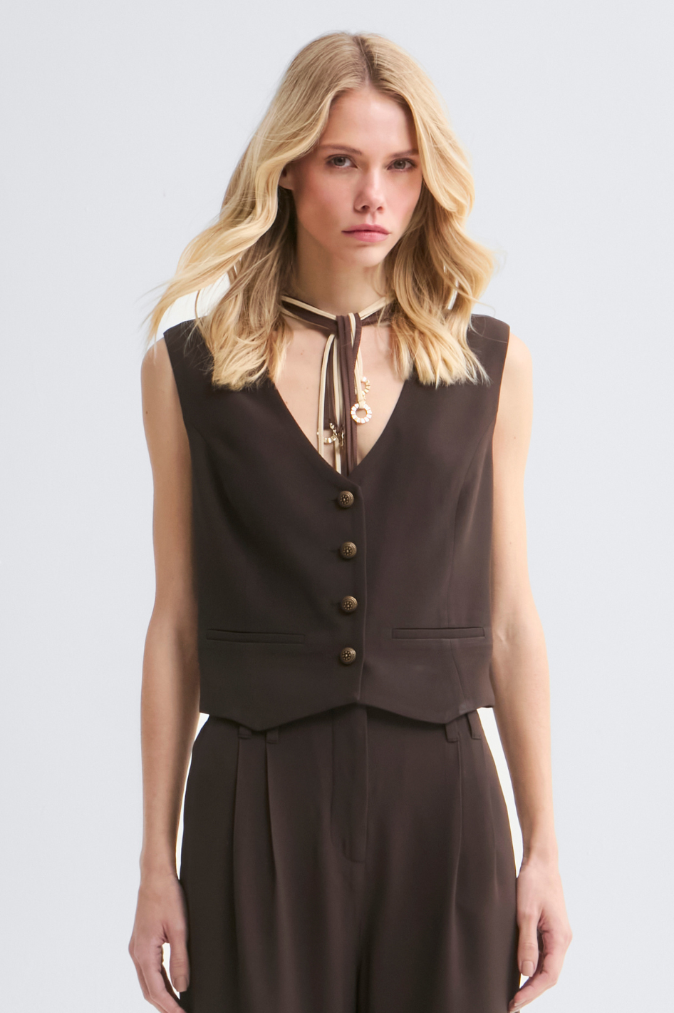 O colete é confeccionado em crepe Patou e totalmente duplo, o que garante caimento impecável, peso sofisticado e a elegância incomparável que só a UP22 oferece. Os botões são um detalhe à parte, verdadeiras obras de arte que elevam ainda mais a peça.