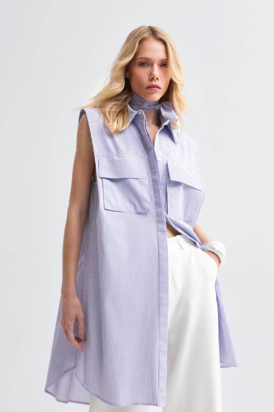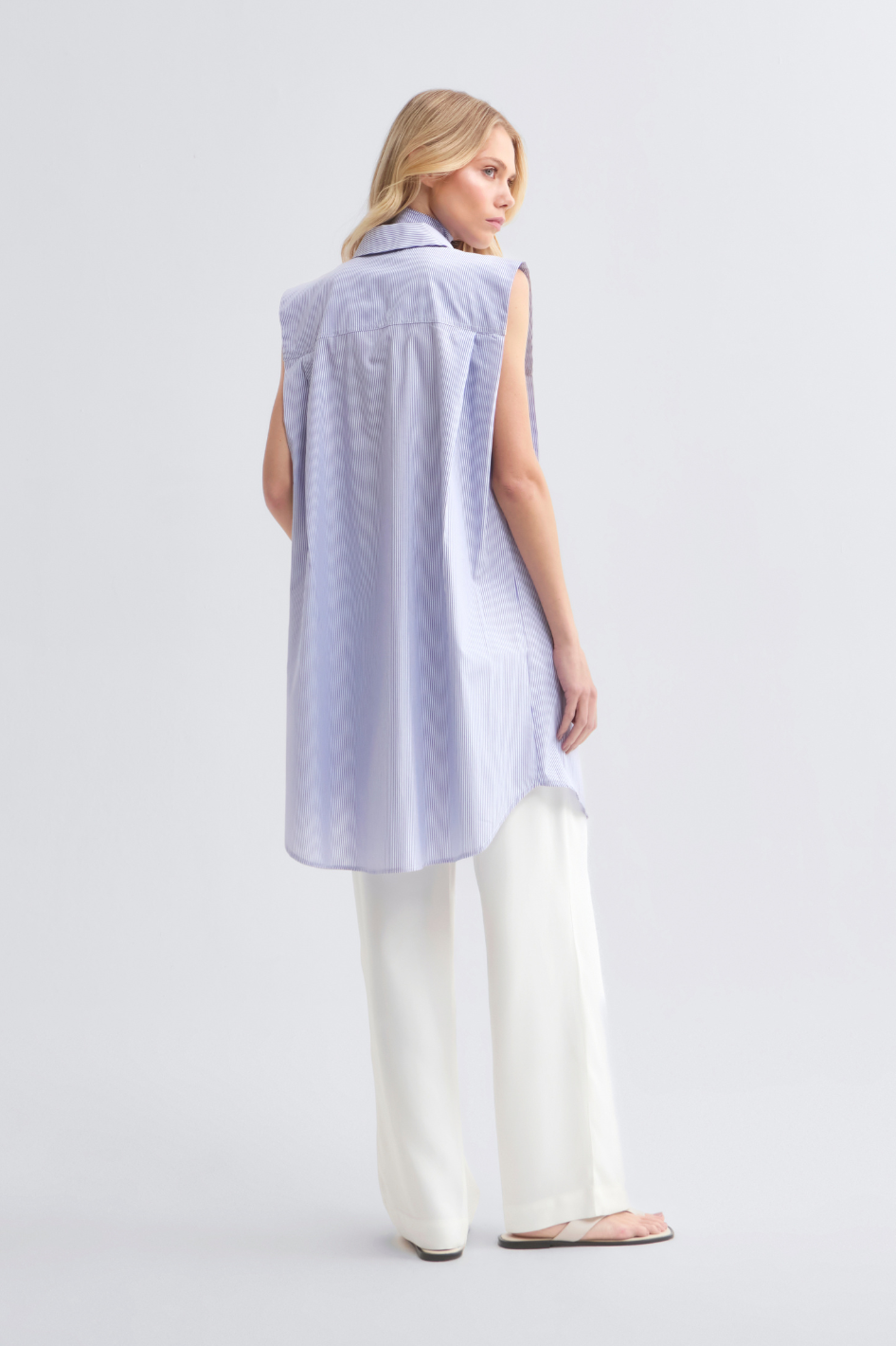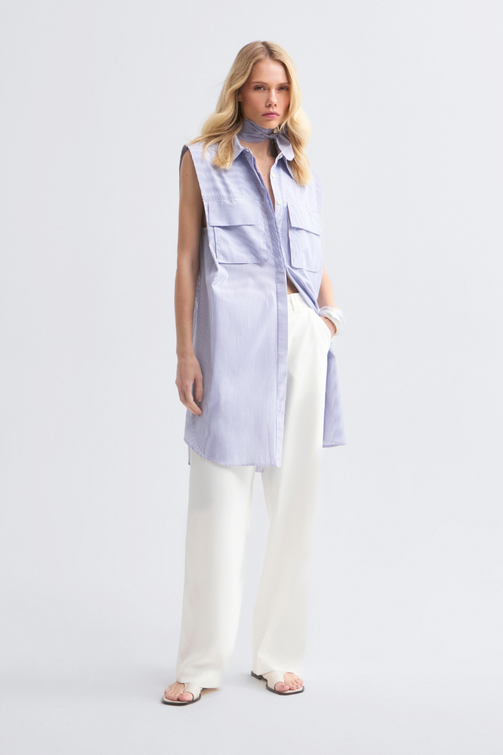 Minimal, versátil e cheio de presença. O vestido Sunnie tem aquele caimento solto e despretensioso que a gente ama. É feito em algodão listrado bem leve e fresquinho, com comprimento no joelho, gola estruturada e botões frontais embutidos. As maxi lapelas nos bolsos dão o toque utilitário — e fazem o contraste perfeito com o ar relax da peça.