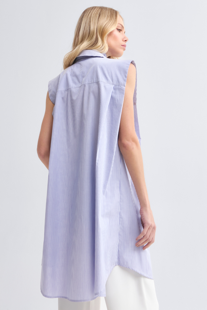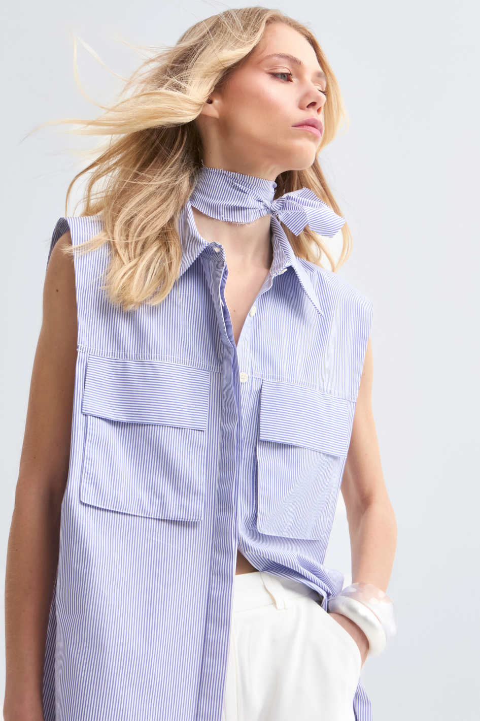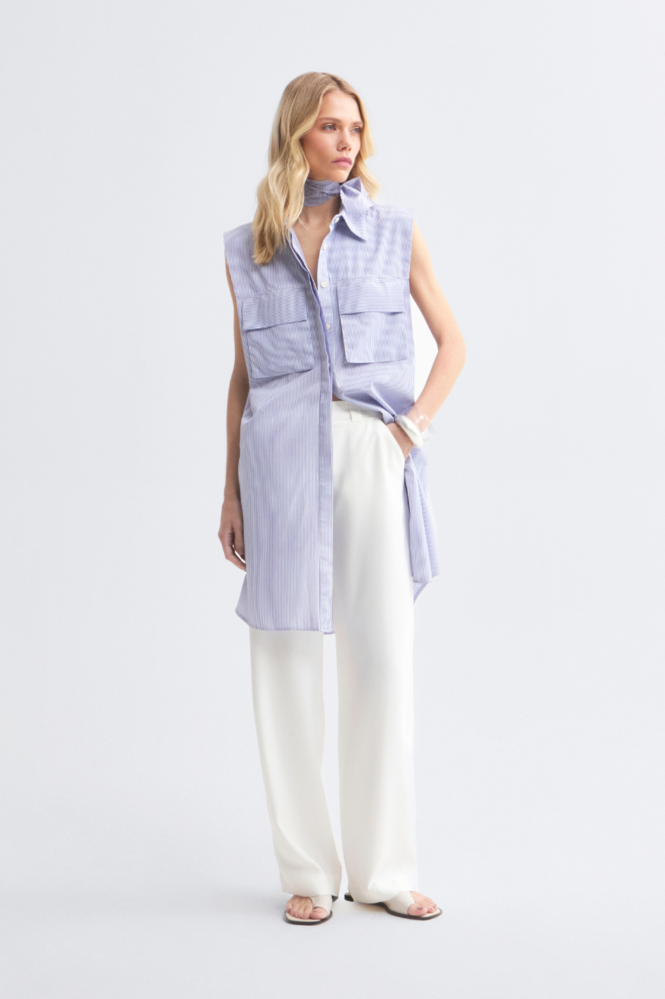 Minimal, versátil e cheio de presença. O vestido Sunnie tem aquele caimento solto e despretensioso que a gente ama. É feito em algodão listrado bem leve e fresquinho, com comprimento no joelho, gola estruturada e botões frontais embutidos. As maxi lapelas nos bolsos dão o toque utilitário — e fazem o contraste perfeito com o ar relax da peça.